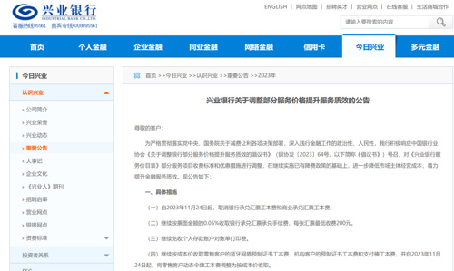 11月22日,兴业银行公告,自今年11月24日起,该行将取消银行承兑汇票工本费和商业承兑汇票工本费;继续按票面金额的0.05%收取银行承兑汇票承兑手续费,每张汇票最低收费200元;继续免收个人存款账户对账单打印费;将零售客户动态令牌工本费调整为按成本价收取。