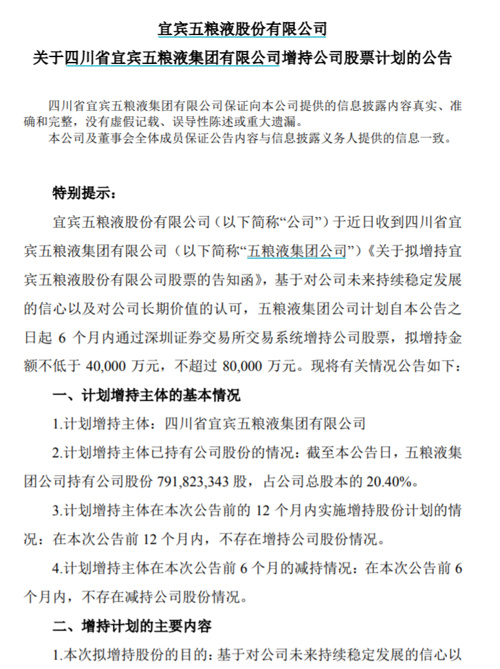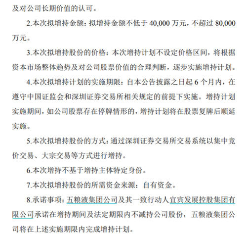 五粮液集团表示,基于对上市公司未来持续稳定发展的信心以及对长期价值的认可,计划自本公告之日起6个月内,以自有资金通过深交所交易系统增持五粮液股票,拟增持金额不低于4亿元至不超过8亿元。