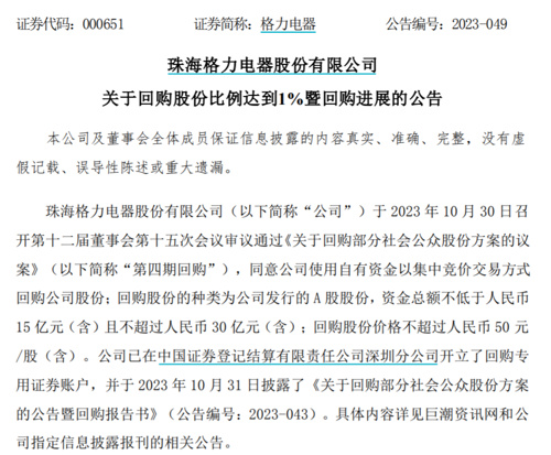 2、格力电器:截至12月11日,已支付20.13亿元回购1.09%公司股份