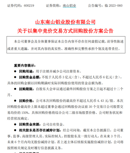 3、南山铝业:拟以3亿元-6亿元回购股份 用于注销减少注册资本