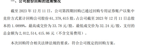 格力电器公布,截至2023年12月11日,公司第四期回购已通过回购专用证券账户以集中竞价方式累计回购公司股份6137.8615万股,占公司截至2023年12月11日总股本的1.0899%,最高成交价为33.78元/股,最低成交价为32.24元/股,支付的总金额为20.13亿元(不含交易费用)。