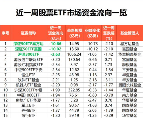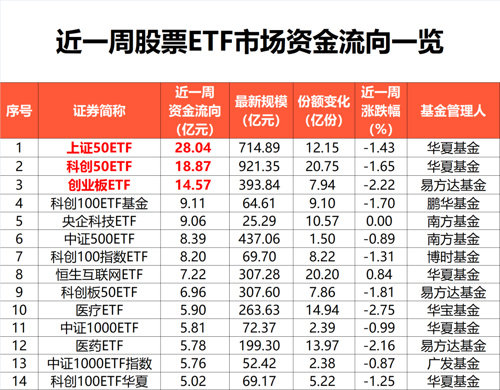 其中,新基金深证50ETF受到资金的流出,易方达、富国旗下深证50ETF本周净流出合计超20亿元;这两只产品都在12月11日上市,是新上市的次新基金。