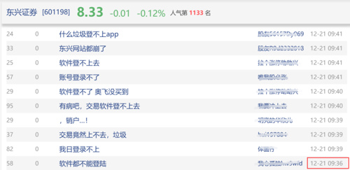 12月21日早间,刚开盘没多久,就有投资者在股吧表示,东兴证券电脑客户端与APP均无法登录或登录之后无法交易。宕机时间超过1个小时后,10点44分左右,有投资者表示可以登陆了。