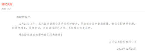 中午时间,东兴证券向投资者发送情况说明称,东兴证券普通交易系统延时增大,导致部分客户登录缓慢。公司立即调动资源,经紧急排查,反复测试,目前该问题已消除,系统服务恢复正常。
