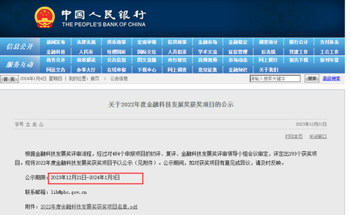 近日,央行网站发布“2022年度金融科技发展奖获奖项目”的公示文件。