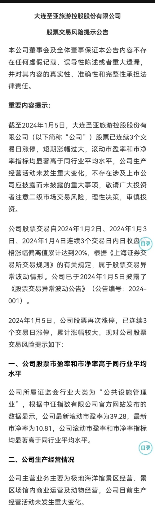 大连圣亚也提示投资风险称,公司股票已连续3个交易日涨停,短期涨幅过大,滚动市盈率和市净率指标均显著高于同行业平均水平,公司不存在涉及上市公司应披露而未披露的重大事项,敬请广大投资者注意二级市场交易风险,理性决策,审慎投资。