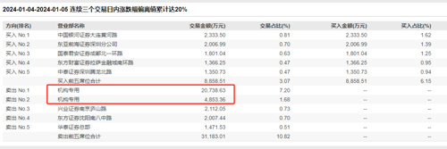 从龙虎榜交易席位来看,最近四个交易日,机构席位都在卖出,而买入席位则主要是券商营业部席位。其中,1月4日~5日,前两大机构席位卖出超2.5亿元。