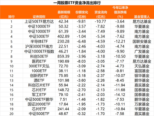净流出方面,主要是南方中证500ETF、南方中证1000ETF、华夏上证科创板50ETF出现3亿元以上的资金净流出。