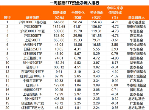 从资金净买入排行榜看,本周16只股票ETF资金净流入达3亿元以上,易方达、华夏、华泰柏瑞和嘉实等旗下四只沪深300ETF、华夏上证50ETF出现显著资金净流入,成本周吸金的绝对主力。