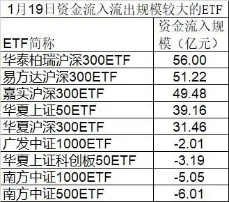 从股票ETF资金流向看,在1月19日小幅震荡行情中,资金继续出现200亿元大幅净流入。其中,华泰柏瑞沪深300ETF、易方达沪深300ETF、嘉实沪深300ETF、华夏上证50ETF和华夏沪深300ETF等五只ETF资金净流入最为显著,均超过30亿元。
