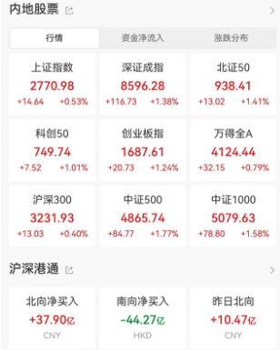 市场共2977只个股上涨,2199只个股下跌,北向资金净买入近38亿元。