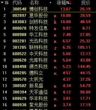 CPO概念走强,剑桥科技、华西股份、意华股份涨停,博创科技、华工科技、联特科技、新易盛、中天科技、光库科技等涨幅居前。