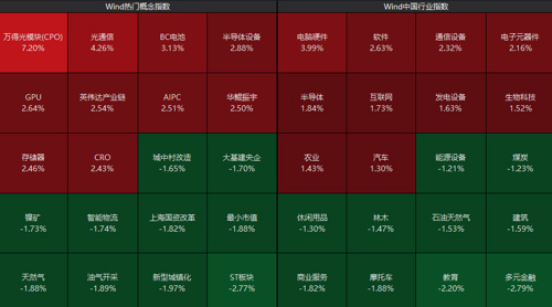 板块上来看,CPO概念股快速走高,算力、互联网等AI应用方向持续发力,半导体概念股表现活跃;而上海国企改革、教育、建筑等板块跌幅居前。