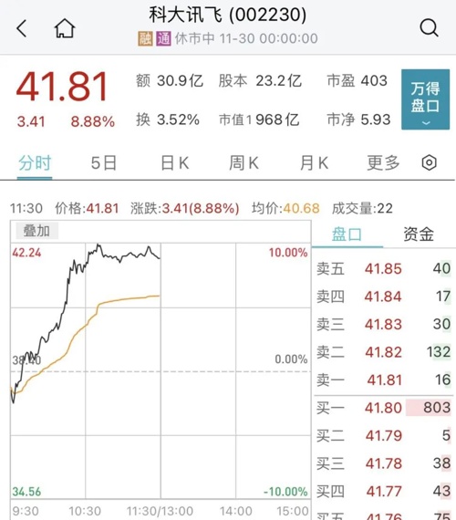 科大讯飞盘中持续拉升,一度触及涨停,成交额超30亿元。