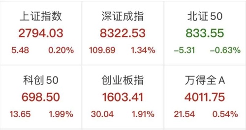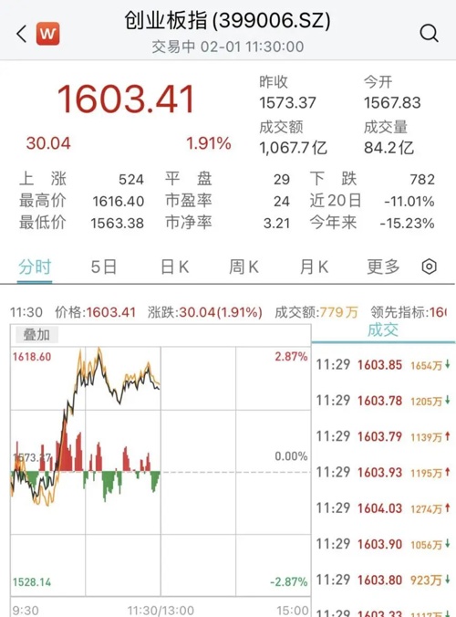 2月1日,A股三大指数全线翻红,创业板指数快速拉升,一度涨逾2.5%。截至午间收盘,沪指涨0.2%,深成指涨1.34%,创业板指涨1.91%。北向资金半日净买入超38亿元。