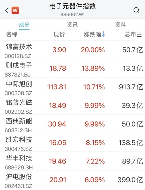 电子元器件板块同样拉升,锦富技术20CM涨停,西典新能、铭普光磁直线拉涨停。