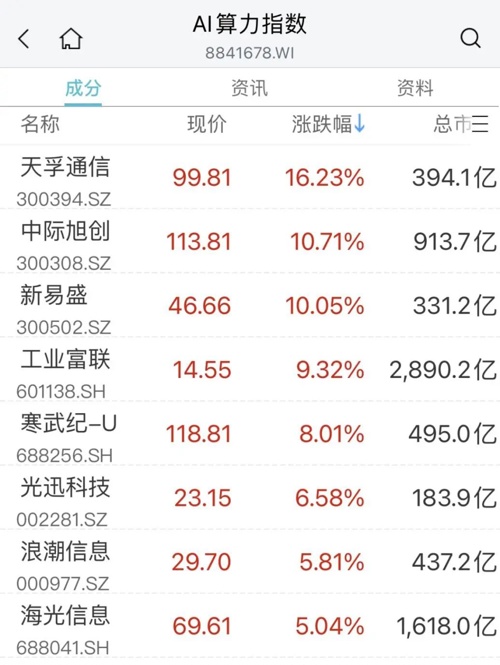此外,算力租赁板块震荡走高,直真科技两连板,工业富联、寒武纪、浪潮信息等涨幅居前。
