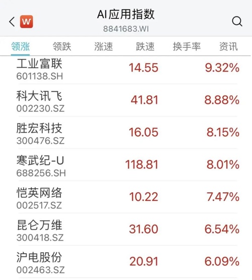 AI概念股持续升温,工业富联一度涨停,寒武纪、恺英网络、金山办公等大涨。