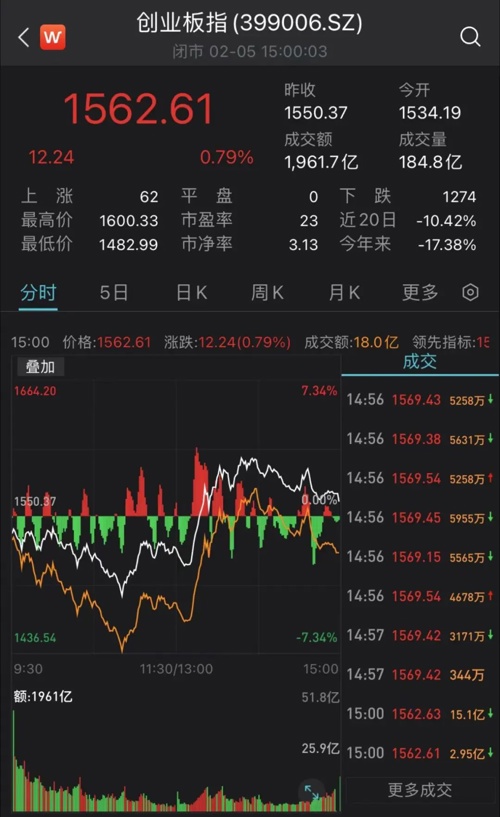 2月5日,A股开盘市场延续深度调整,上证指数一度跌破上周五最低点,微盘股持续大跌,午后市场触底反弹,呈现“深V”走势,创业板指标股强势拉升,创业板指、深证成指先后翻红。