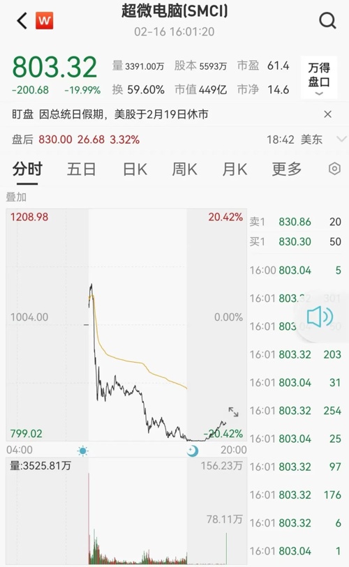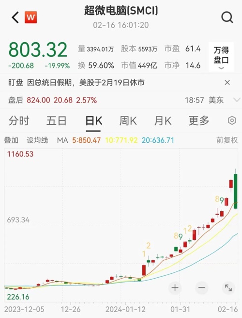 美东时间2月16日,超微电脑(SMCI)结束九个交易日的连续上涨,一度大跌20.42%,最终收于803.32美元,跌19.99%。
