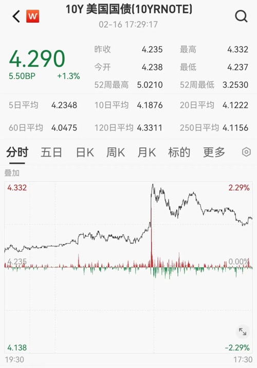 美东时间2月16日,受美国PPI增速高于预期影响,美债收益率全线上涨。2年期美债收益率涨7个基点,报4.652%。3年期美债收益率涨6个基点,报4.422%。5年期美债收益率涨6.1个基点,报4.28%。10年期美债收益率涨4.9个基点,报4.284%。30年期美债收益率涨2.8个基点,报4.439%。