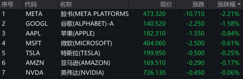科技股“七姐妹”全线走低。Meta跌2.21%,谷歌跌1.58%,苹果跌0.84%,微软跌0.61%,特斯拉跌0.25%,亚马逊跌0.17%。