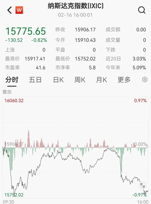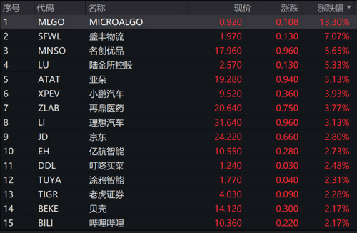 美东时间2月16日,纳斯达克金龙中国指数涨0.56%。MLGO涨13.30%,盛丰物流涨7.07%,名创优品涨5.65%,领涨该指数成份股。