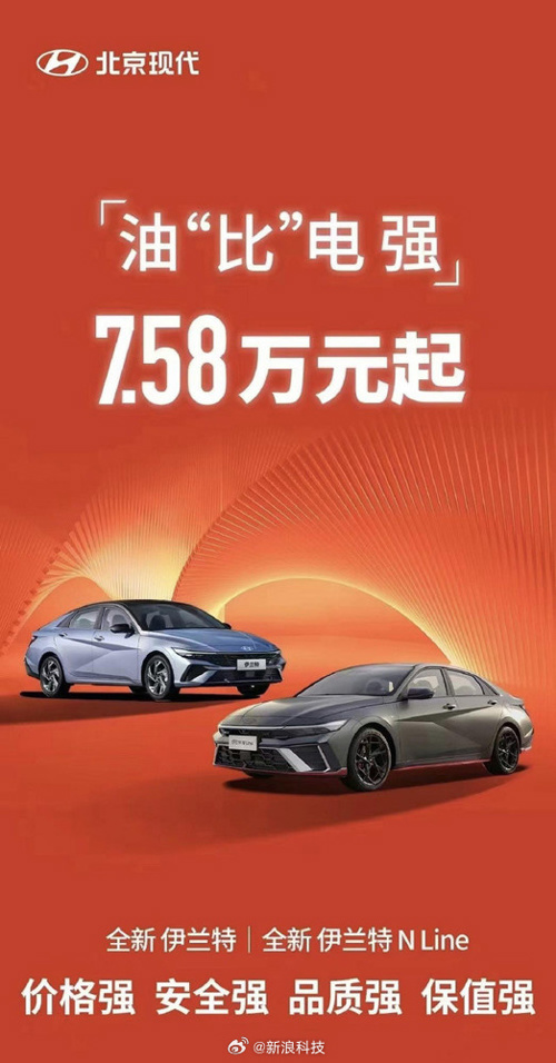 北京现代也宣布,旗下A级轿车伊兰特车型正式降价,最低7.58万元起。有意思的是,北京现代还特意喊出了“油“比”电强”的口号!