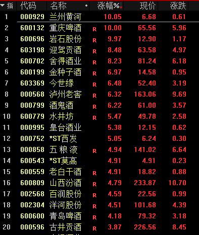 白酒股表现活跃,兰州黄河、重庆啤酒、岩石股份涨停。股民戏称,股市大涨,今晚开酒庆祝!