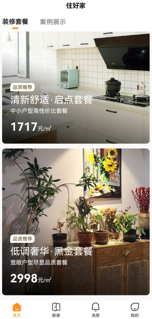 “住好家”则是住小帮旗下整体家装业务。2022年12月,“住好家”推出独立App,为用户提供全屋设计、标准化施工以及售后保障服务。目前,该App正常运营,首页列示两种套餐的装修服务,分别为1717元/㎡和2988元/㎡。