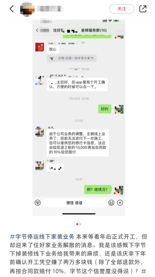 在社交平台上,也有客户晒出相关聊天记录,称准备3月装修的订单被退订,客服要求提供相关信息后发起退款流程,七个工作日内完成退款。另有客户表示,客服承诺除全部退款外,再按合同款赔付10%,对信誉度表示认可。