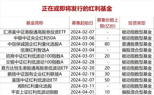 其中,仅3月以来启动首发的就有4只,比如中银中证央企红利50、中信保诚国企红利量化选股、信澳红利智选、招商中证红利低波动100指数。另有汇添富中证港股通高股息投资ETF、交银中证红利低波动100指数、易方达恒生港股通高股息低波动ETF、鹏扬中证国有企业红利联接、富国中证红利低波动ETF等也在发行中。