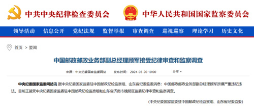 3月20日,中央纪委国家监委官网通报,中国邮政邮政业务部副总经理顾军接受纪律审查和监察调查。