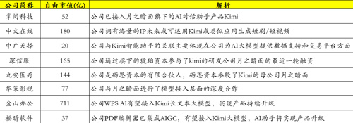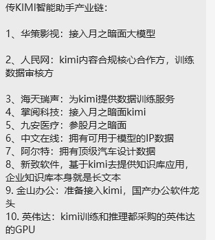kimi在国产模型中当前使用效果较好,关注三条主线:1)国产模型的持续迭代,后续多模态模型的上线,有望赋能应用层面。2)应用层面接入kimi等模型,带来应用效果的提升。关注AI+应用有进展的公司,比如掌阅科技等。3)模型作为内容生产工具,有望带来影视/短剧/短视频/游戏等诸多内容领域产能和内容精度的大幅提升,建议关注优质IP储备和影视内容制作,以及AI生视频模型的公司。