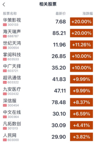 20日,相关的概念股纷纷大涨!海天瑞声、华策影视、中广天择、超讯通信、掌阅科技等涨停。