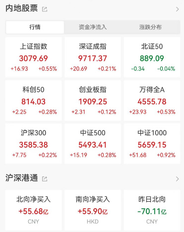 市场共3876只个股上涨,1267只个股下跌。北向资金净买入56亿元。