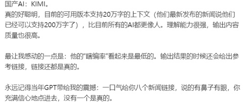 券商称,KIMI的意义不单单是大模型能力层面的意义,更多在于找到明确且刚性的用户需求和应用场景,产品具备较强记忆点;同时,KIMI通过在长文本能力上的突破,其应用场景正逐步从长文章分析往AI陪伴(如给定剧本/小说让其扮演其中角色)、AI AGENT(给专业领域材料完成特定任务)方向上发展,对于国产大模型以及国内AI应用探索具备重要意义。