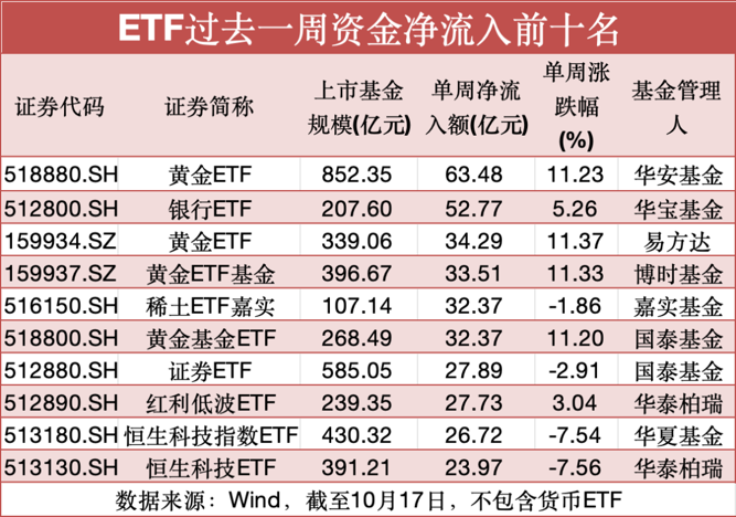 伴随着近期市场风格切换,黄金ETF、银行ETF等避险资产受到市场青睐,多只产品资金净流入居前。