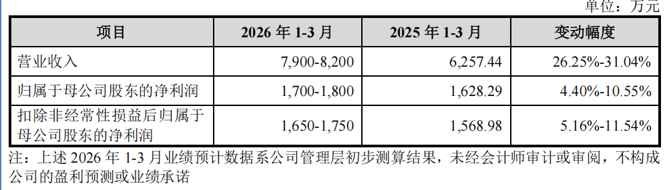 招股说明书显示,恒道科技预计其2026年第一季度的营业收入为7900万元至8200万元,同比增长26.25%至31.04%;归母净利润为1700万元至1800万元,同比增长4.40%至10.55%。