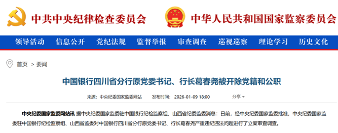 1月9日,中央纪委国家监委官网通报:中国银行四川省分行原党委书记、行长葛春尧被开除党籍和公职。