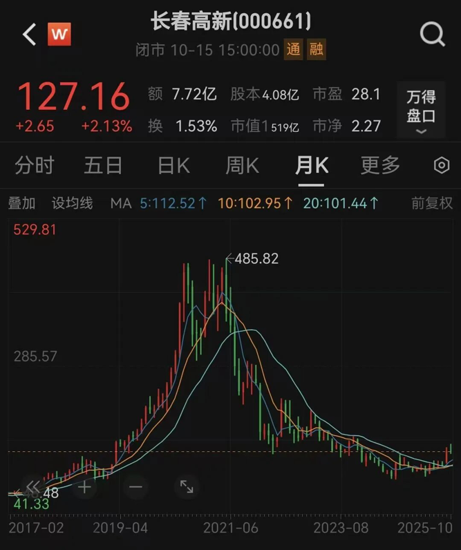 10月15日,长春高新股价以127.16元/股收盘,最新市值为519亿元。