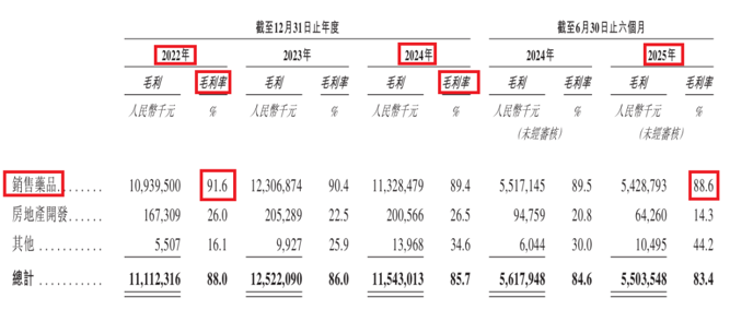 长春高新销售药品的毛利率从2022年的91.6%,持续下滑至2025年上半年的88.6%。