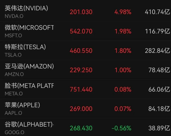 此外,特斯拉上涨1.80%,亚马逊上涨1.00%,脸书上涨0.08%,苹果上涨0.07%,谷歌下跌0.56%。