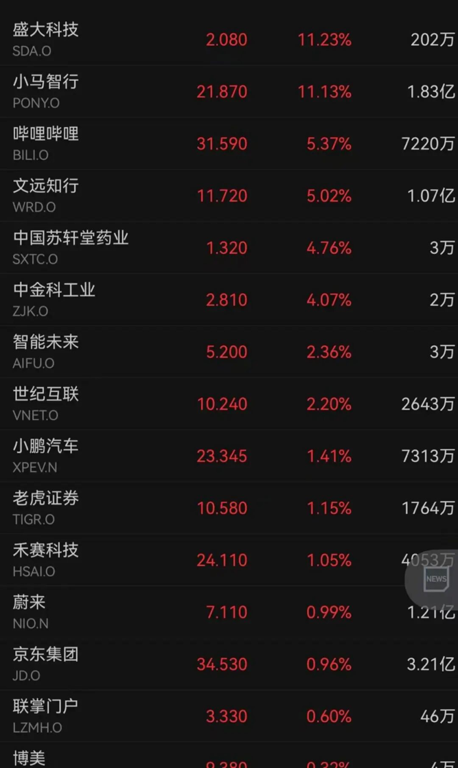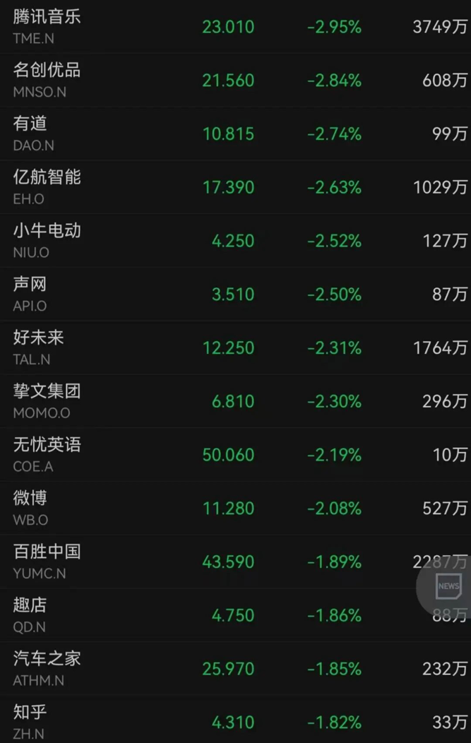 互联网板块,哔哩哔哩、文远知行、京东集团分别上涨5.37%、5.02%、0.96%;汽车股小鹏汽车、蔚来分别上涨1.41%、0.99%。腾讯音乐、名创优品、有道、百胜中国等分别下跌2.95%、2.84%、2.74%、1.89%。