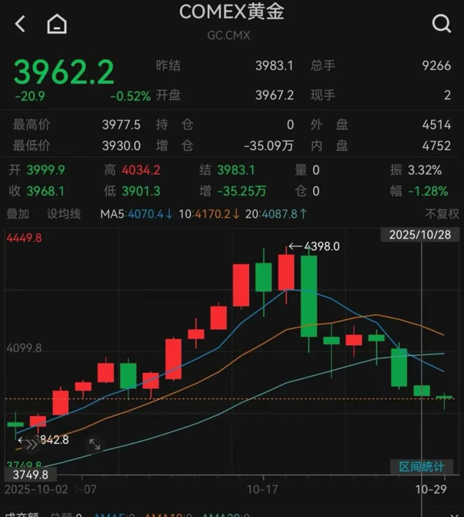 COMEX黄金指数日内曾跌近3900美元/盎司。本轮黄金价格调整时间已有一周。