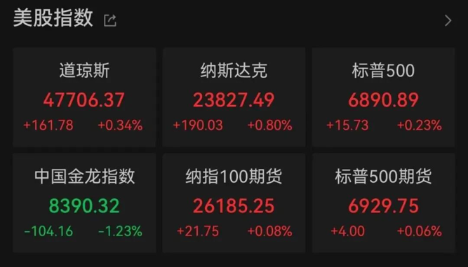 截至收盘,道琼斯指数上涨0.34%,报收于47706.37点;纳斯达克指数上涨0.8%,报收于23827.49点;标普500指数上涨15.73点,报收于6890.89点。