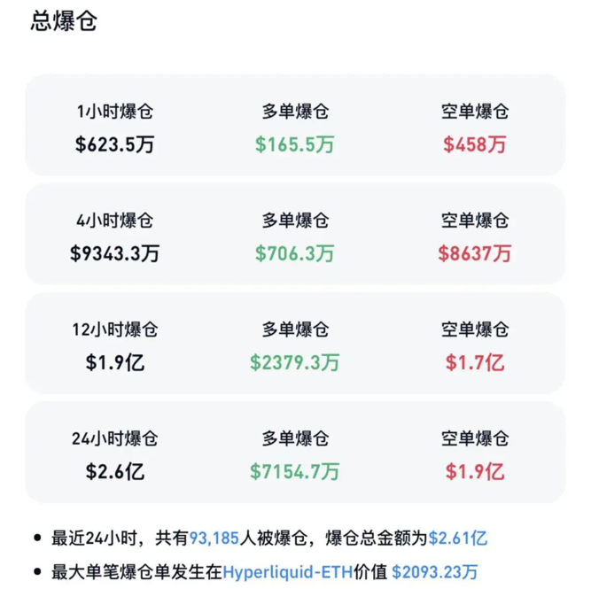 Coinglass数据显示,过去24小时加密货币市场共有超9万人被爆仓,爆仓总金额为2.61亿美元,其中多单爆仓7154.7万美元,空单爆仓1.9亿美元。其中,最大单笔爆仓发生在Hyperliquid-ETH。