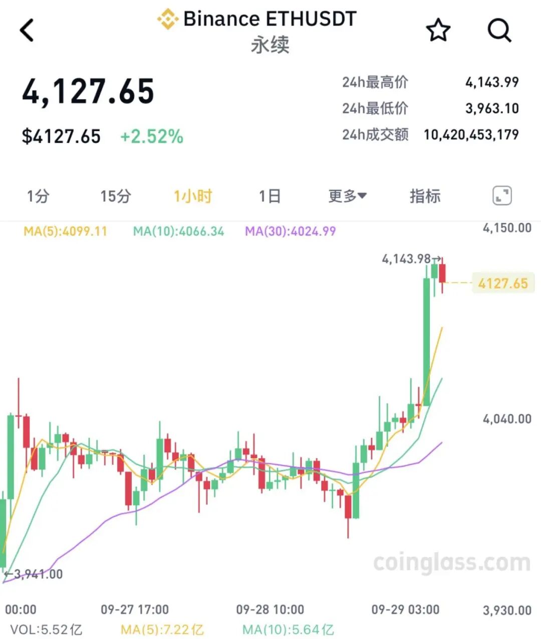 以太坊同样拉升,一度涨超3%,突破4100美元/枚。