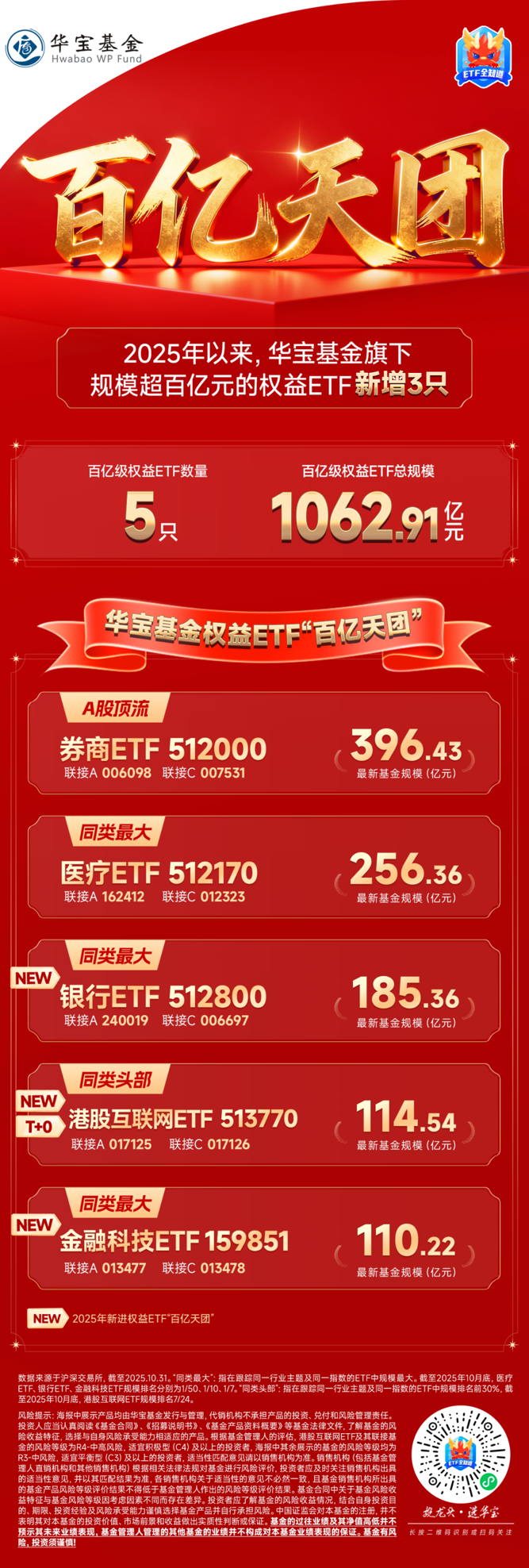 2025年,银行ETF(512800)、金融科技ETF(159851)、港股互联网ETF(513770)这3只热门ETF,基金规模先后升破100亿元大关。由此,华宝基金旗下跻身“百亿ETF俱乐部”的股票ETF数量增至5只,5只股票ETF的基金规模合计高达1062.91亿元。(数据来源:沪深证券交易所;时间截至2025.10.31)