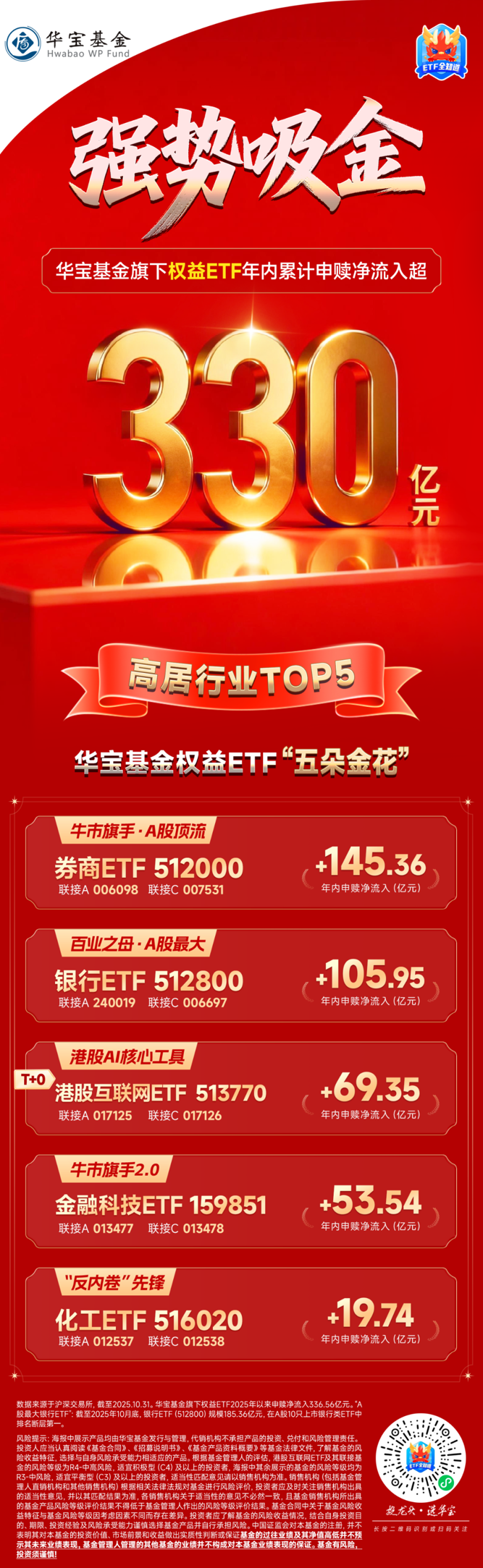 此外,A股规模最大的银行指数ETF——银行ETF(512800)年内资金净流入105.95亿元;港股AI核心工具——港股互联网ETF(513770)年内资金净流入69.35亿元;“反内卷”先锋——化工ETF(516020)年内资金净流入19.74亿元。这5只ETF均是当前市场细分行业领域的龙头产品,也是2025年华宝基金股票ETF吸金榜上的“五朵金花”,其资金流入、流出情况,成为市场对相关行业板块投资情绪的一个缩影。(数据来源:沪深证券交易所;时间截至2025.10.31)